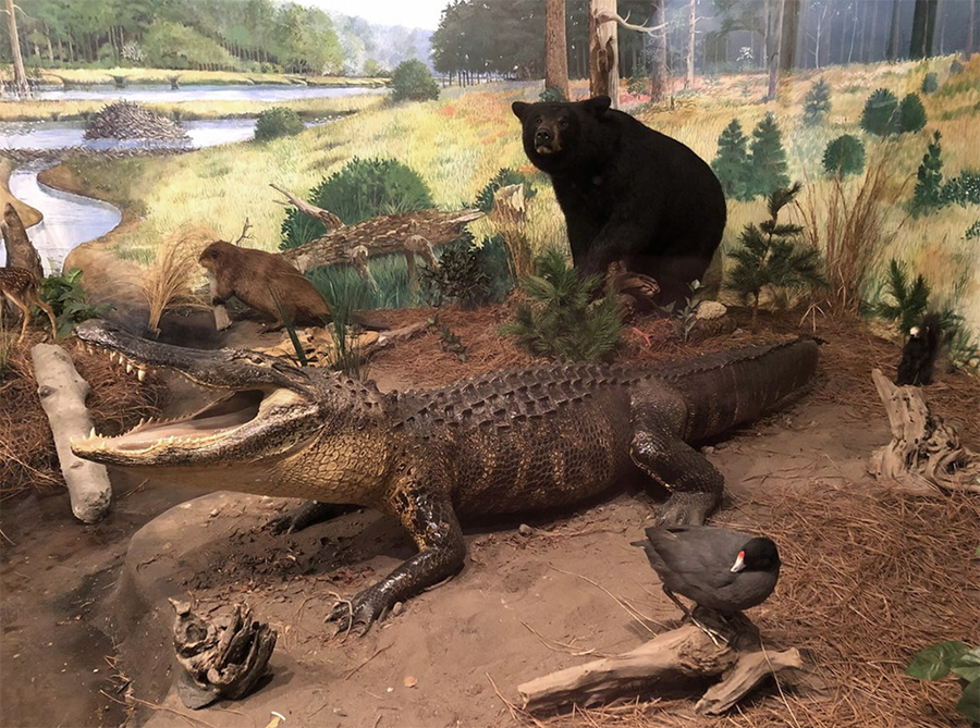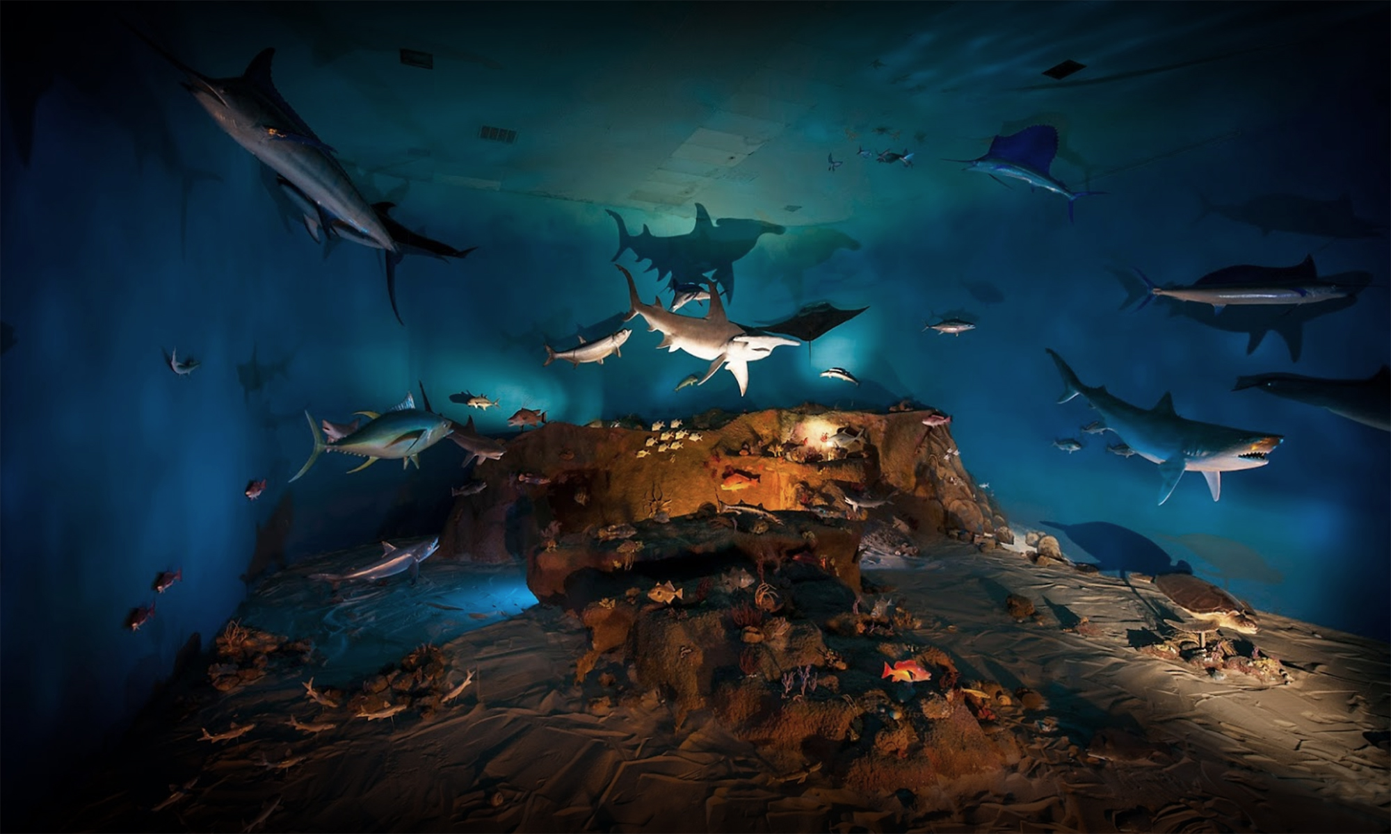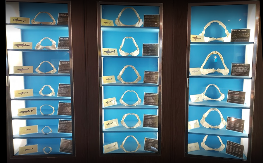 Animal exhibits include an aquarium and a touch tank with live sea animals, shells, fossils, insects, a display about sharks, live snakes, bird dioramas and an ocean reef diorama that includes life-sized models of whales, sharks, sea turtles and rays.