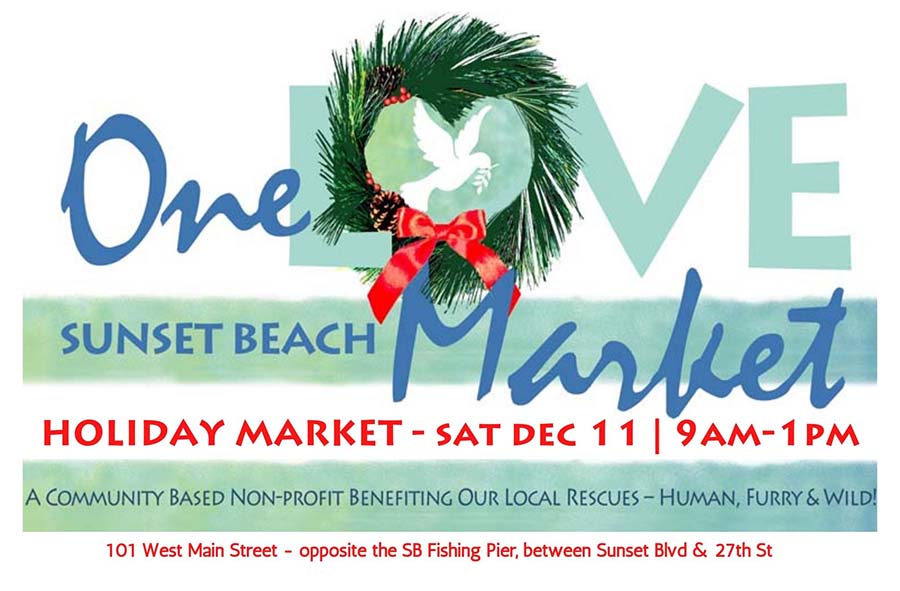 Festivities and holiday fun continue at One Love Market Saturday December 11 from 9am to 1pm on Sunset Beach with 38+ artisans, live music performed by John Toppings, a free holiday craft table for kids and families, 50/50 raffle AND so much more!!